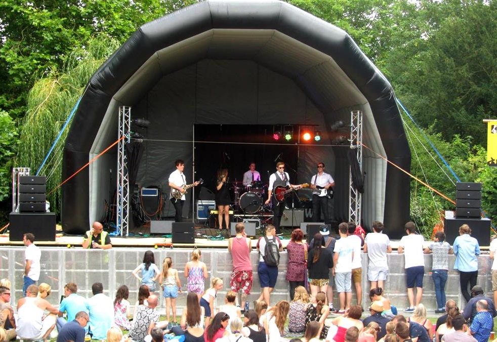 The 6m x 4m Inflatable Stage comes with a stage cover and stage decks to form a 6m x 4m base on which the cover sits which makes a usable space of 5m x 4m suitable for small bands at mini festivals up to 1000 people. The staging can be up to 4ft high with increments of 1ft. This takes roughly 2 hours to assemble.