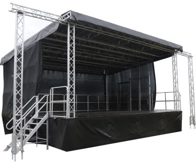 The 8m x 6m Round Arch Stage Roof comes with the stage cover, stage platform, steps, and handrails. This stage roof system is perfect for audiences of up to 3,500 people. The stage is 3ft off the ground with the total height of the structure at 4.8m heigh. We can supply PA risers at the side of the stage or PA Wings to fly line arrays. The setup time for this stage is around 6 – 8 hours. The site requires suitable access for a 7.5T Truck.